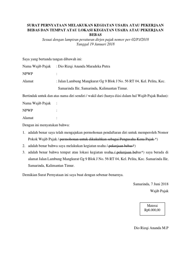 Contoh surat pernyataan menjalankan usaha untuk npwp. Sama halnya dengan Guideline 34 dalam VAT Directive yang merupakan ketentuan bersama terkait PPN di Uni Eropa juga terdapat ketentuan yang digunakan dalam menentukan tempat dilakukannya konsumsi. Surat Kuasa Pajak adalah surat yang dibuat sebagai penunjukan secara resmi kepada seseorang atau pihak lain untuk melaksanakan hak danatau memenuhi kewajiban pajak sesuai ketentuan peraturan perundang-undangan di bidang perpajakan. Untuk menciptakan nilai tambah produkjasa dari usaha anda.